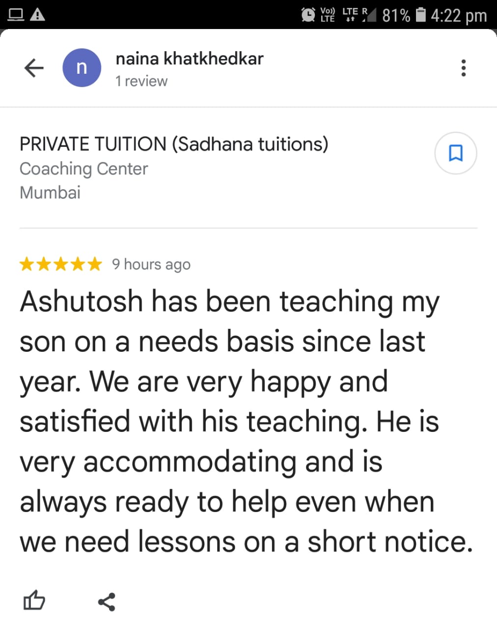 I am a freelance Mathematics tutor, teaching students from schools in Mumbai and abroad in Dubai, Singapore, Australia, Canada and Europe upto IBDP and A levels since late 2017.